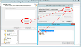 Aparecerá un asistente para la delegación del control. Lo iniciamos con Next, y en la siguiente pantalla pulsamos Add, pulsamos sobre "tipos de objeto" para agregar "equipos", y así poder poner SCCM, que es el nombre que le dimos a nuestro servidor.